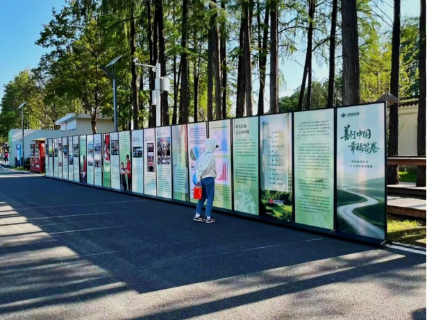 漫步在波光粼粼的湖畔,一邊欣賞自然美景,一邊在“愛心”板塊前駐足。這裡的展板設計充分考慮了自然環境特點,採用開放式布局,讓公益故事與自然景觀相映成趣。展板上那些記錄福彩發行宗旨的圖片,映襯著美麗的自然環境,更顯生動感人。